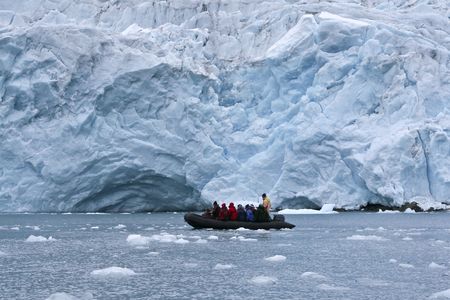 Tourists in front of a glacier in Napassorsuaq Fjord, Greenland