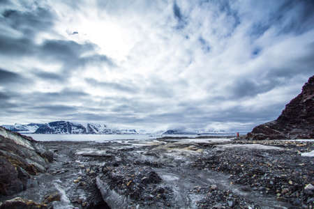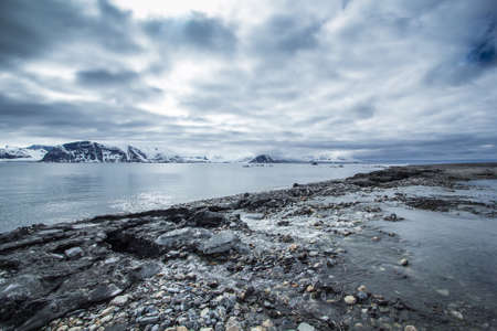 Landscape of distant snow covered mountains behind the rocky shore of an arctic fjord in Svalbard