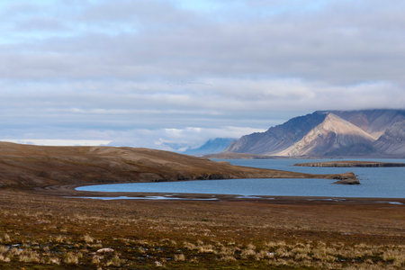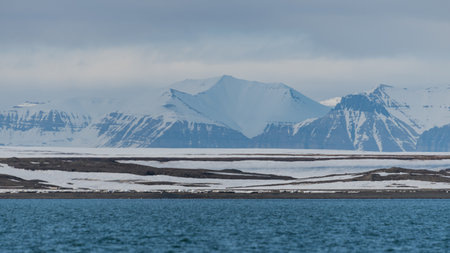Coastal landscape with snow-capped mountains In the area of Barentsburg Svalbard, Norway