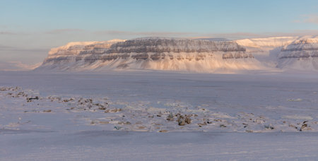 Arctic winter landscape with frozen fjord and snow covered mountains on Svalbard, Norway