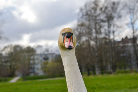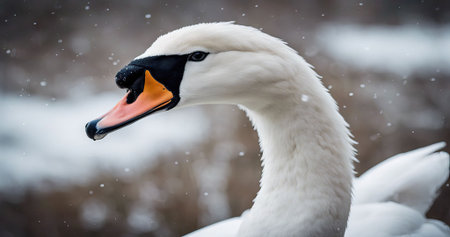 portrait of a white swan is isolated on a blurred background. close-up. Animal portrait