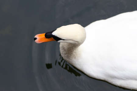 Front view of white swan on blue dark lake. Head, orange beak close up. Wild waterfowl in nature