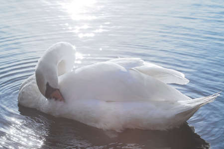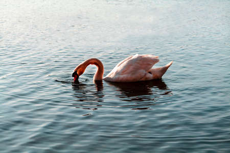Beautiful white swan swimming on a lake at sunset. The mute swan