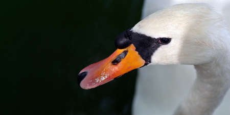 Portrait of a graceful white swan with long neck on dark green water background. The mute swan, Cygnus olor