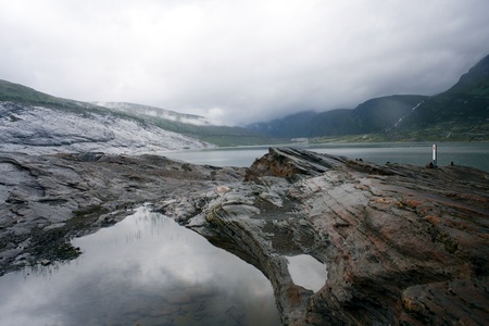 Amazing view of the glacier in Jostedalsbreen national park, Norway on a cold foggy cloudy day