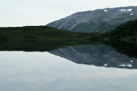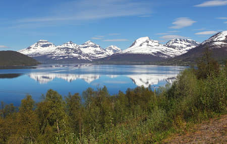 the beautiful Norwegian landscape. mountains in snow and reflection in water
