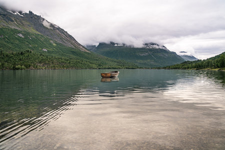 A lonely boat rests peacefully on the clear waters of Innerdalsvatna lake surrounded by stunning mountains and gentle clouds in scenic Innerdalen valley, Møre og Romsdal Norway.