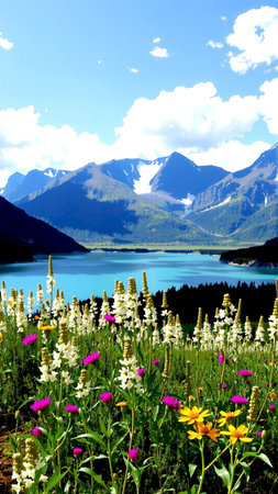 View of Portage glacier in the Chugach mountains and Portage lake on the background and pink blooming fireweed on the foreground. Shot in the USA, Alaska, in summer.