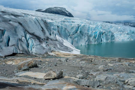 Beautiful scenery on the mountains and the glacier Svartisen landscape in Norway scandinavian nature landmarks ecology concept. Blue snow and ice.