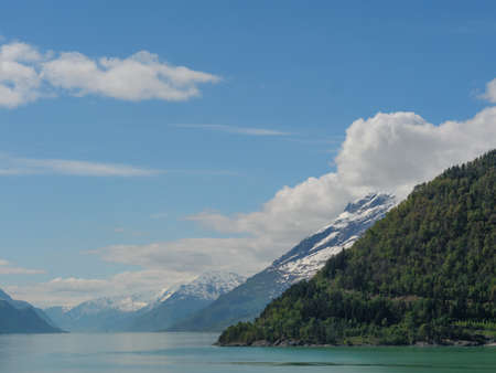 Beautiful scene of a landscape with high snowy mountains and sea.