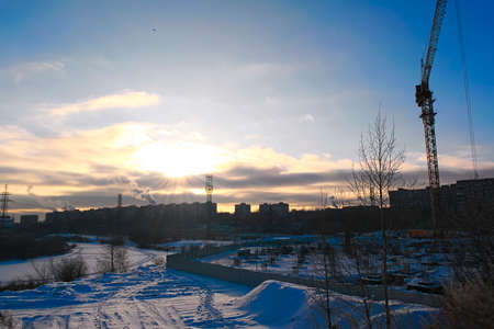 Sunset in the city in the winter in a strong frost
