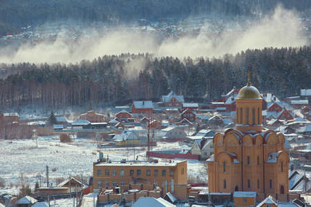 Cityscape of a small town in winter. Aerial view