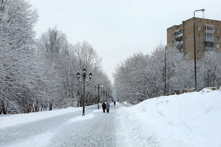 Walking area along the Pekhorka River. City park in winter. City of Balashikha, Moscow region, Russia.