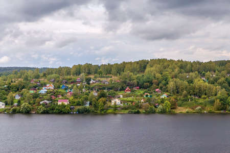 Aerial view of the Svir river and houses in urban-type settlement, Nikolskiy, Leningrad region, Russia.