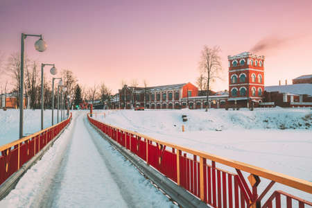 Dobrush, Gomel Region, Belarus. Old Paper Factory Tower In Winter Evening. Historical Heritage
