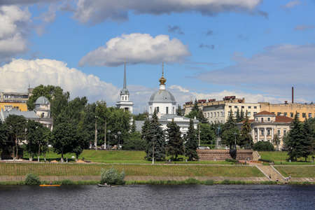 View of the monument to Athanasius Nikitin and the resurrection Church on the banks of the Volga river. Russia, the city Tver, July 30, 2020