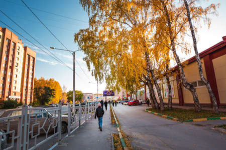 The city of Berdsk, Novosibirsk region, Western Siberia of Russia - October 9, 2021: autumn cityscape with trees and fallen yellow leaves