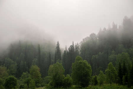 Landscapes of Siberia. Early morning on the Kiya river. Fog over a forest in the mountains. Kemerovo region.
