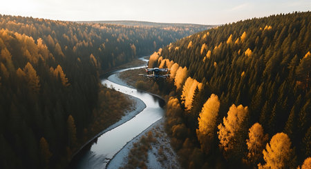 Aerial view of a drone flying over a river in autumn forest
