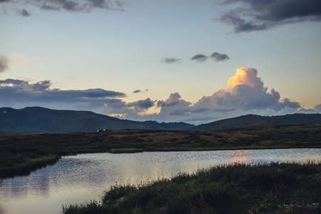 Scenic sunset landscape with yellow big cloud in form of explosion above mountain lake. Awesome giant cloud reflected in lake water in sunrise. Huge cloud of illuminating color in dawn gradient sky.