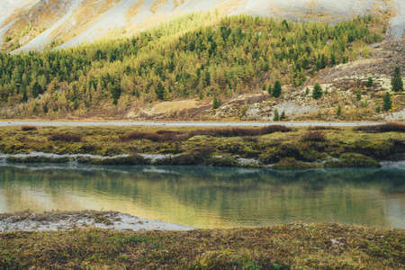 Scenic autumn landscape with mountain lake and motley mountains with forest. Colorful alpine view to shallow lake and big multicolor hills in autumn colors. Beautiful vivid mountain scenery in fall.