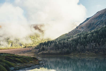 Colorful autumn landscape with mountain lake and coniferous trees with hoarfrost on hill with view to forest mountain in golden sunshine in low clouds. Sunlit yellow and frosty white larches in fog.