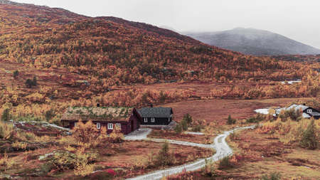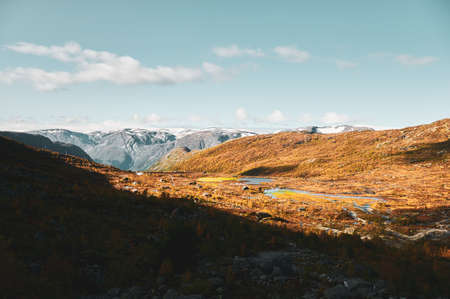 Beautiful scenic view of massive scandinavian mountains at autumn season.