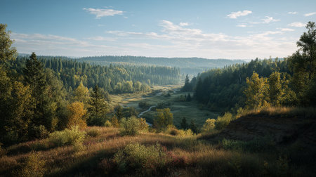 Scenic Forest Valley Landscape with Winding Stream and Atmospheric Haze