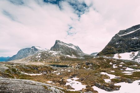 Typical norwegian landscape with snowy mountains and clear lake near the Trolltunga rock - most spectacular and famous scenic cliff in Norway