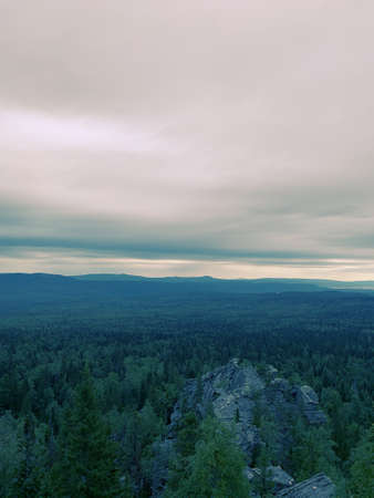 View of a mountain valley on a cloudy day, on top. Siberia