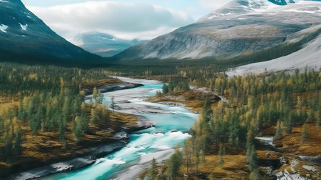 Stunning aerial view of a turquoise river winding through an autumnal forest, nestled amidst majestic mountains.