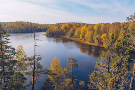 Lake in Karelia among larch trees, Russia. Beautiful autumn season landscape with river and forest stock photo