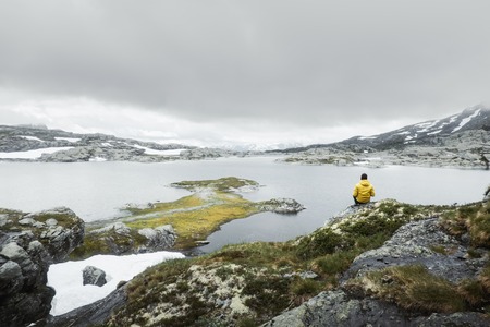 travel photographer taking photo of snowy landscape in Norway in spring, person near beautiful frozen lake in mountains