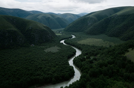 Aerial view of a river flowing through a green valley in the mountains