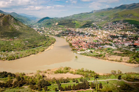 Beautiful springtime aerial view of Mtskheta, Georgia, showcasing the historic town and the convergence of Aragvi and Kura rivers