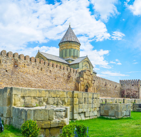 The archaeological site next to fortress walls of Svetitskhoveli Cathedral, with its dome on the background, Mtskheta, Georgia.