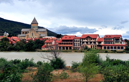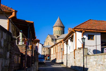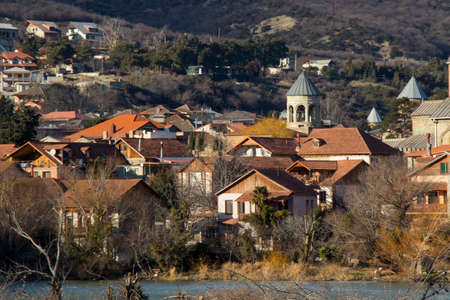 Old famous town in Georgia, Mtskheta. Old hauses and church Svetiskhoveli. Travel destination.