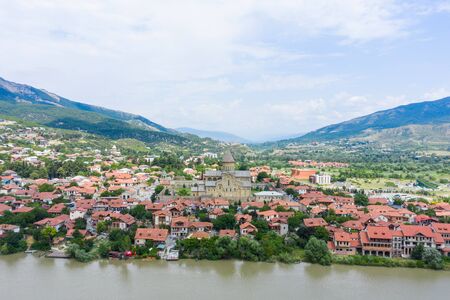 Panoramic beautiful aerial view of Mtskheta town with the rivers Kura and Aragvi in Georgia