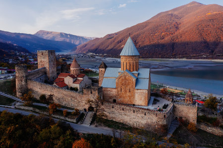 Ananuri Fortress, on mountains and blue sky background, historic landmark located in the Ananuri village with castle complex that consists of two churches, popular tourist destination in Georgia.