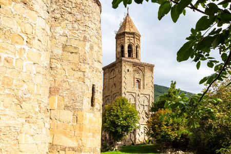Ninotsminda, Georgia - September 24, 2023: bell tower and wall of Ninotsminda Cathedral in Kakheti region of Georgia on sunny autumn day