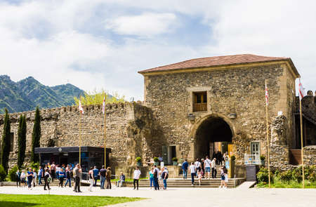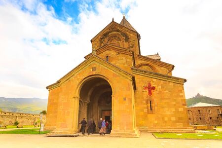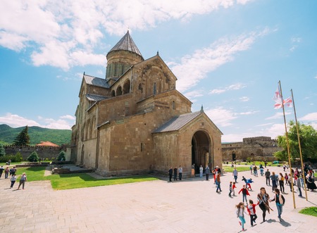Mtskheta, Georgia - August 2019: Svetitskhoveli Cathedral of Mtskheta, Georgia and visitors. It is an Eastern Orthodox cathedral, the second largest church building in Georgia.