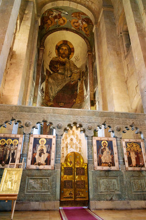 Mtskheta, Georgia - September 26, 2016: Inside of Svetitskhoveli Cathedral. Interior walls are painted with frescoes, but many of them did not survive