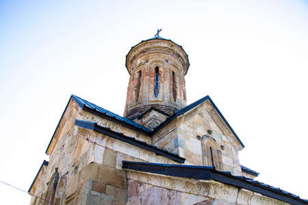Mtskheta, Georgia - January 14, 2022: Old famous town in Georgia, Mtskheta. Old houses travel destination. Svetitshkoveli cathedral and church view.