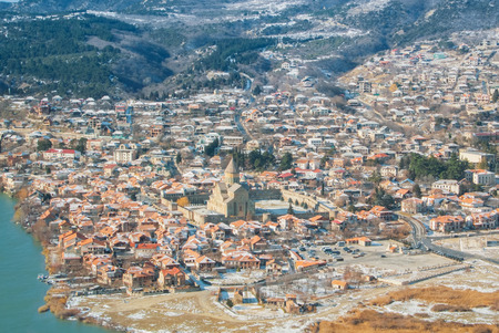 Panoramic view of Mtskheta, an old town at the confluence of two rivers Mtkvari And Aragvi and Svetitskhoveli Cathedral, ancient georgian orthodox church, Unesco heritage, on winter sunny day.