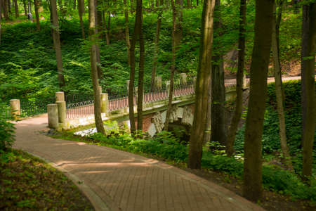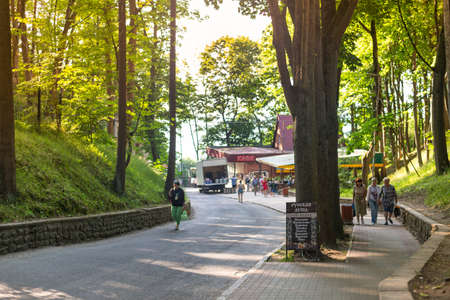 SVETLOGORSK, RUSSIA - June 25th, 2021: Road to Baltic sea promenade with old woods, people walking