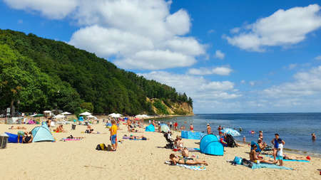 Gdynia, Poland - July 18, 2021: People are resting on the beach on a sunny day in Gdynia Orlowo, Poland