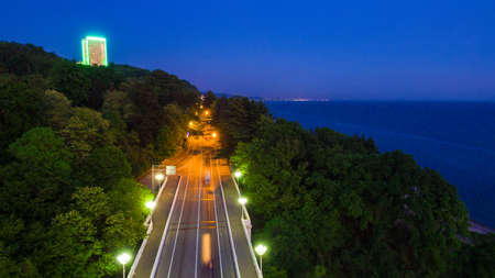 Drone view of the illuminated Matsesta viaduct and mountainside with dense forest on the background of the sea at twilight, Sochi, Russia
