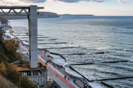 Svetlogorsk, Kaliningrad region, Russia, November 4, 2020. Elevator for tourists from the sea coast. Construction of the elevator on the street. An unfinished street elevator.