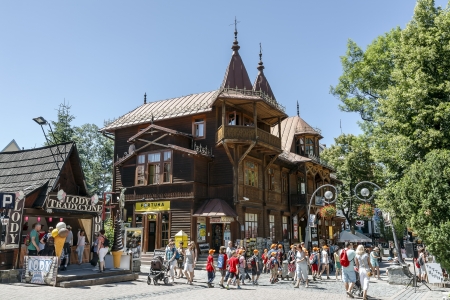 ZAKOPANE, POLAND - September 29, 2018: People on street for tourist walking and promenade in the city center in Zakopane in Poland
