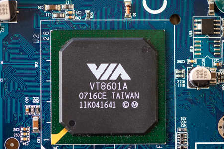 Timisoara, Romania - April 02, 2019: Close-up of a VIA VT8601A North Bridge Single-Chip Socket-370 PCI. Electronic components